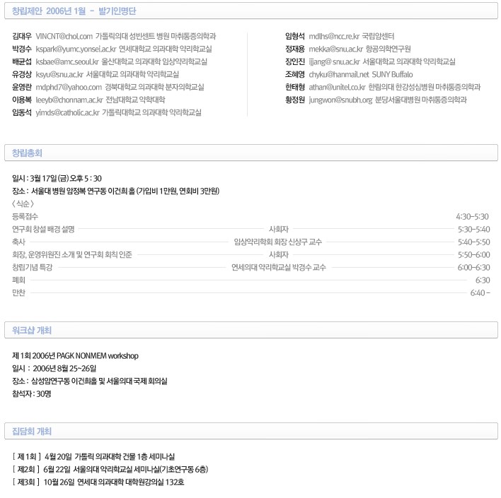 History 2006 창립제안 2006년 1월 - 발기인명단 김대우 박경수 배균섭 유경상 윤영란 이용복 임동석 임형석 정재용 장인진 조혜영 한태형 황정원 2007 2008 2009 2010 2011 2012 2013 2014